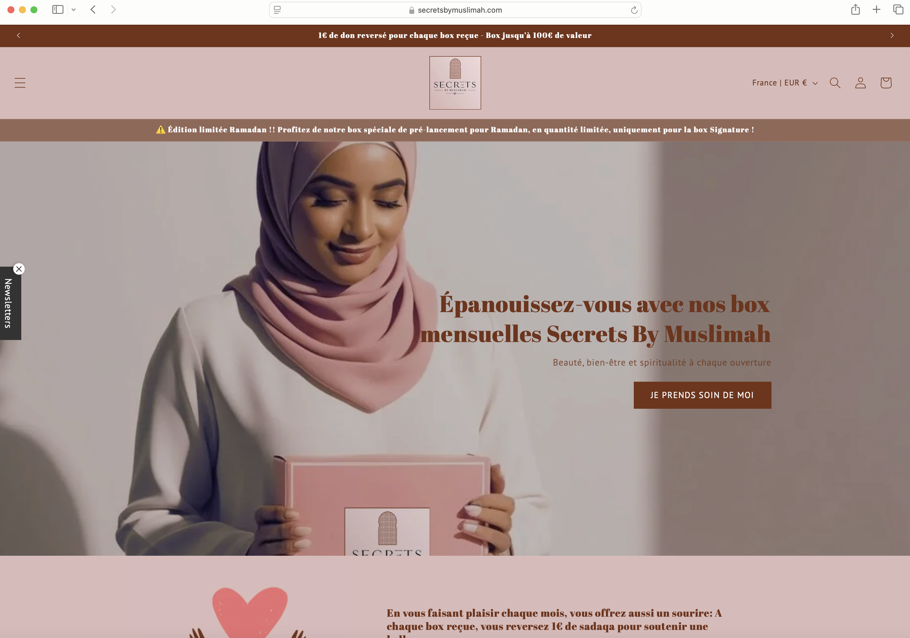Nous avons créer ce projet pour Farrah, la fondatrice de SecretsByMuslimah, afin d'offrir un moment unique aux femmes de la communauté musulmane. Le site a été fait sur Shopify une page d'accueil 90% codé par mes soins.